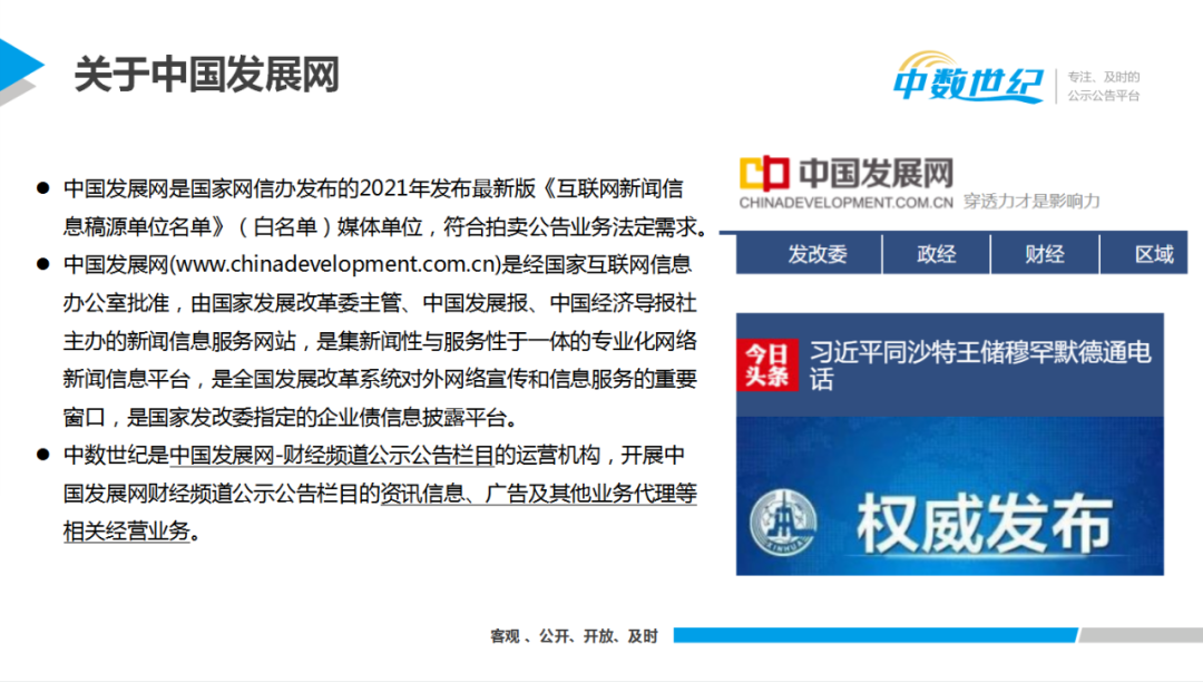 拍賣(mài)公告的依法合規(guī)發(fā)布,是拍賣(mài)企業(yè)規(guī)范運(yùn)營(yíng)、拍賣(mài)交易有別于其它交易的重要體現(xiàn)。中國(guó)發(fā)展網(wǎng)財(cái)經(jīng)頻道在公示公告欄目為拍賣(mài)企業(yè)開(kāi)通了發(fā)布咨詢(xún)信息、發(fā)布公示公告的權(quán)限。在中國(guó)發(fā)展網(wǎng)發(fā)布公告,符合《互聯(lián)網(wǎng)新聞信息管理規(guī)定》相關(guān)法律法規(guī)要求,與傳統(tǒng)紙質(zhì)媒介具有同等法律效力,并有區(qū)塊鏈存證下載技術(shù)。在網(wǎng)絡(luò)平臺(tái)發(fā)布公告還可改善“拍賣(mài)公告”傳播范圍和公告信息留存,更預(yù)示著行業(yè)迎來(lái)“新風(fēng)向”。 相較于以報(bào)紙為代表的傳統(tǒng)公告發(fā)布渠道,公示公告平臺(tái)具有三大優(yōu)勢(shì): 第一,及時(shí)便捷。不被發(fā)版時(shí)間掣肘,發(fā)布更高效。 第二,版面優(yōu)化與擴(kuò)大。專(zhuān)有的“公示公告”欄目,讓你的公告更加醒目,形成信息圈層,吸引高質(zhì)量關(guān)注;用圖文混排的形式,讓公告發(fā)揮更大的價(jià)值。 第三,即刻分享。每篇公告擁有獨(dú)立鏈接,動(dòng)動(dòng)小手廣而告之。 專(zhuān)注、及時(shí)的公示公告平臺(tái)讓拍賣(mài)企業(yè)體驗(yàn)數(shù)智時(shí)代的更優(yōu)選擇!
